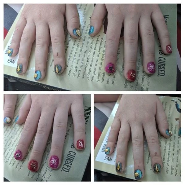 Och Linnea och jag har också haft en nagelsalong där vi har tagit hand om naglarna. Pappas hemlighet till dålig teknik kompenseras med massor av dekorationer.